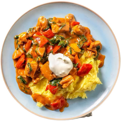 Krēmveida paprikas vista ar kartupeļu biezeni un spinātiem