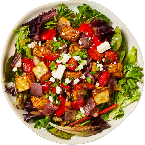 Sagatavojieties svaigu, vieglu vakariņu salātu idejai, kas ir lieliski piemērota arī pusdienām vai vēlajām brokastīm. Sāciet ar jauktiem zaļuajiem salātiem, kas pagatavoti garšīgajā grieķu salatu mērcē, pēc tam pielieciet ar oregano apceptus kartupeļus, papriku un sīpolu, un pabeidziet ar sāļo drupināto fetu un svaigiem pētersīļiem.